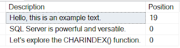 SELECT Description, CHARINDEX('example', Description) AS Position